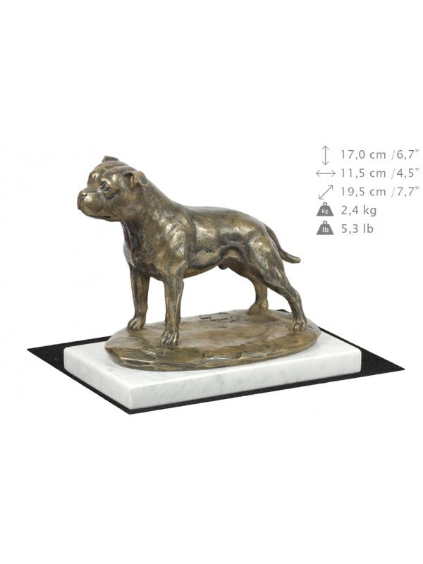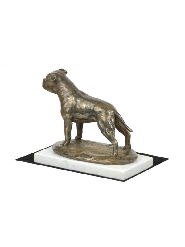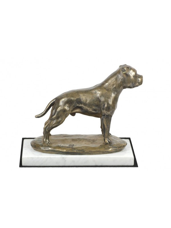 Handgjord Staffordshire bullterrier-statyetti kallstöpt brons med interiör i stark kvarts ståendes på vit marmor i begränsad upplaga.