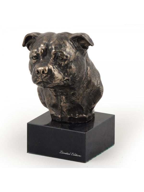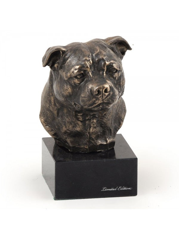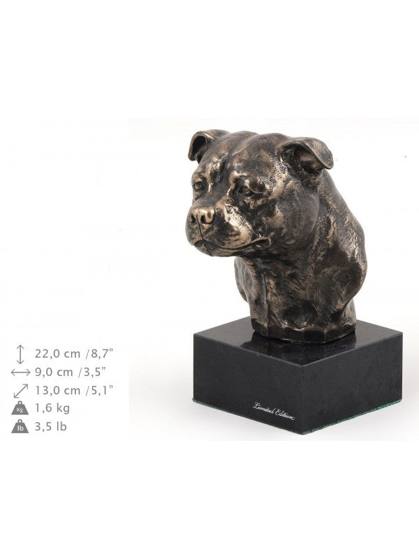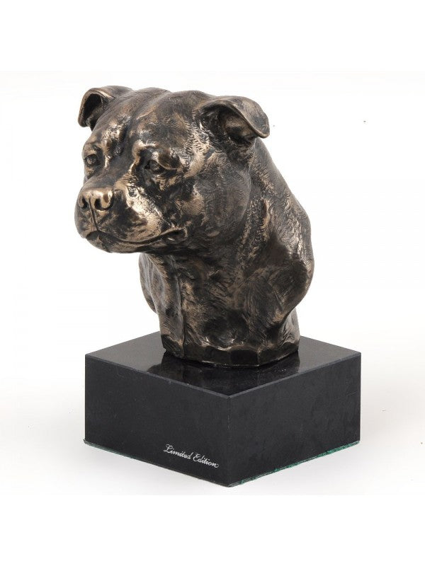 Handgjord Staffordshire terrier-figurin i kallstöpt brons med interiör i stark kvarts ståendes på marmor i begränsad upplaga.