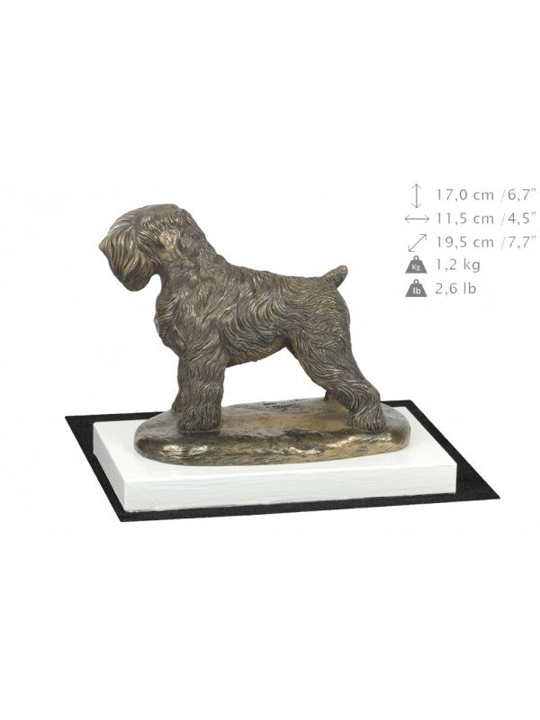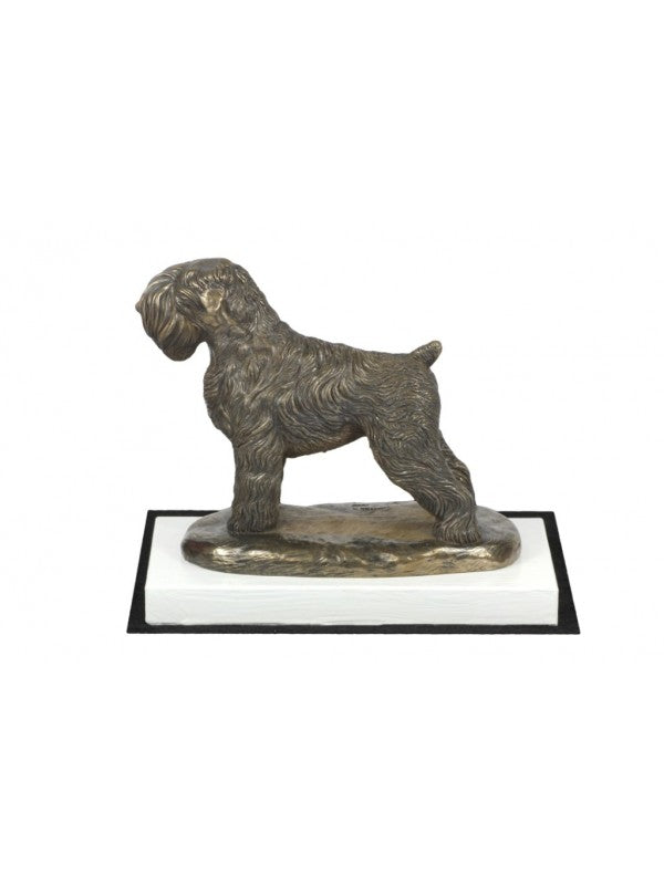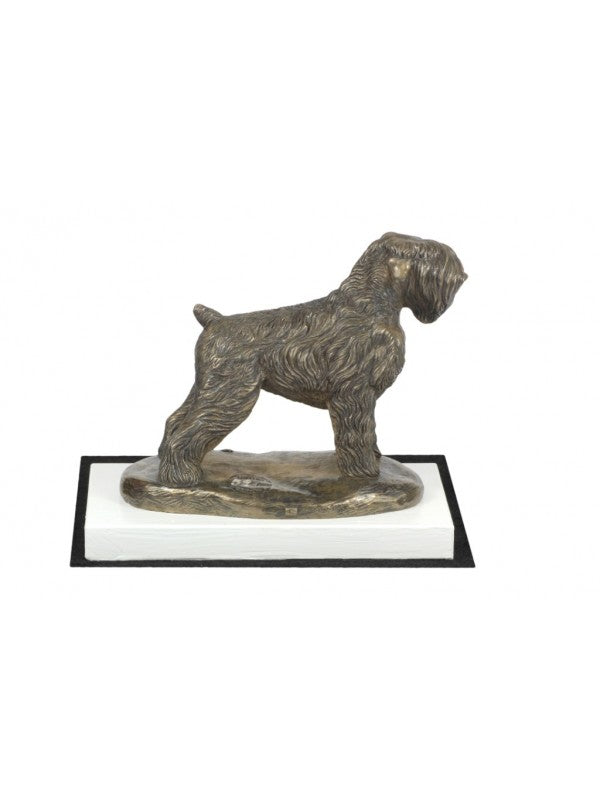 Handgjord Svart rysk terrier-statyett i kallstöpt brons med interiör i stark kvarts ståendes på bas i vitt trä i begränsad upplaga.