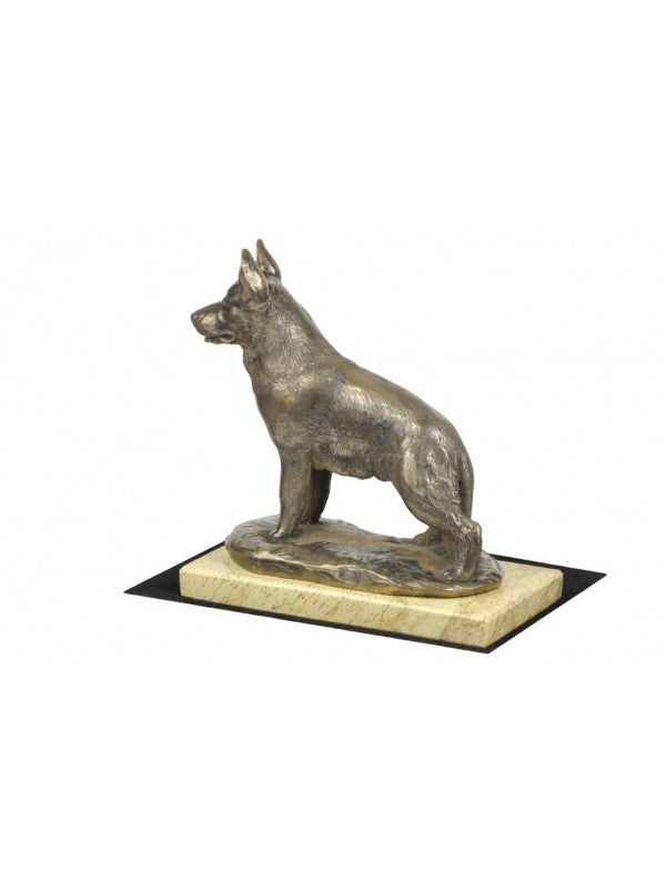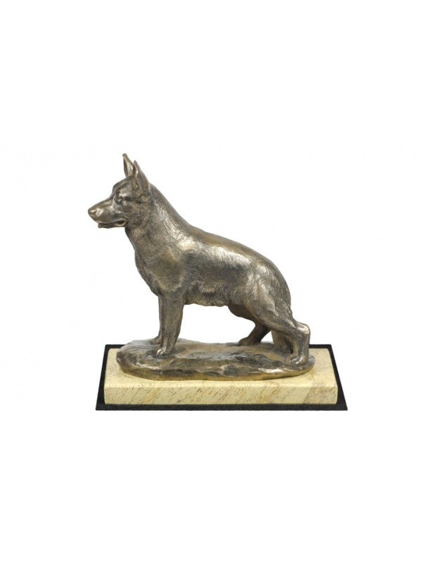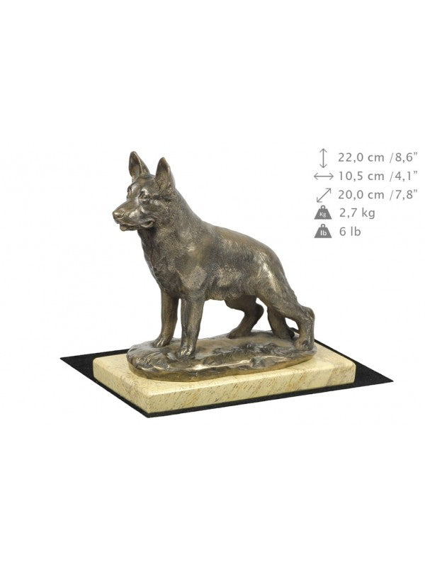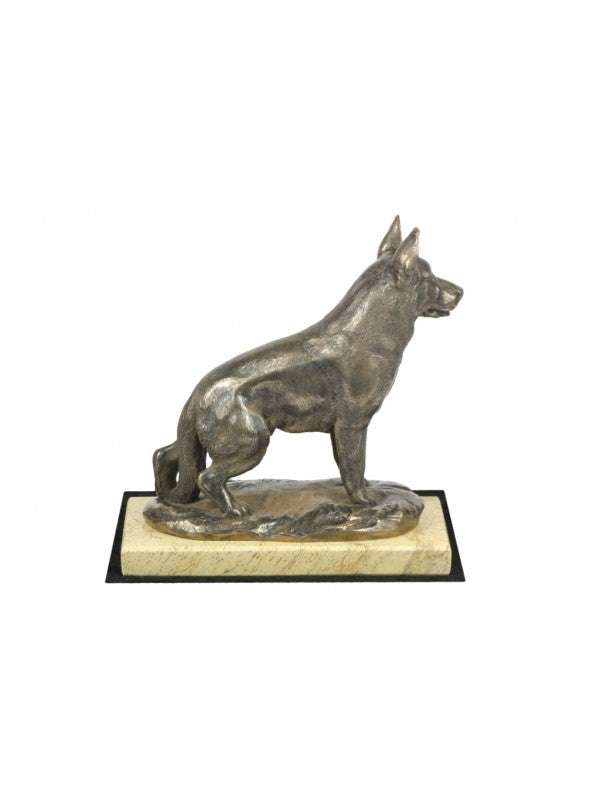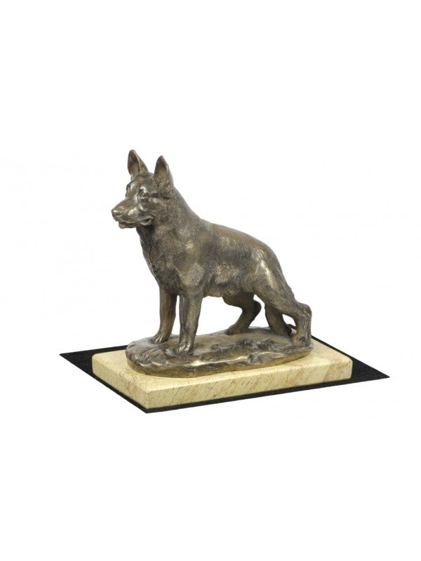 Handgjord Tysk Schäferhund-statyett i kallstöpt brons med interiör i stark kvarts ståendes på sandmarmor i begränsad upplaga.