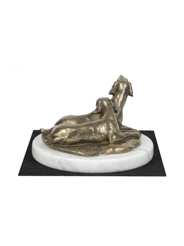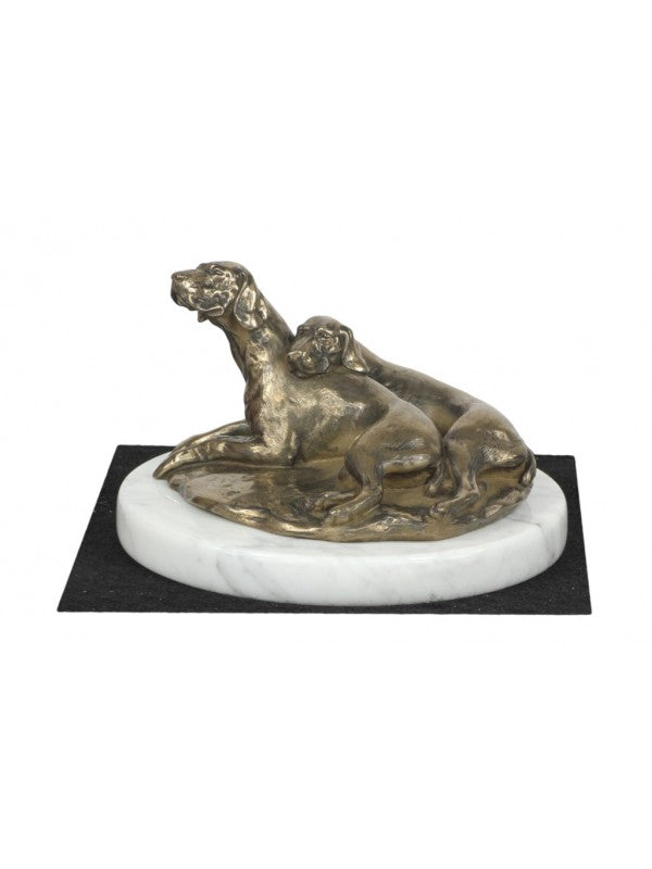 Handgjord Weimaraner-statyetti kallstöpt brons med interiör i stark kvarts ståendes på vit marmor i begränsad upplaga.