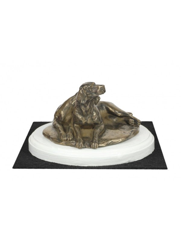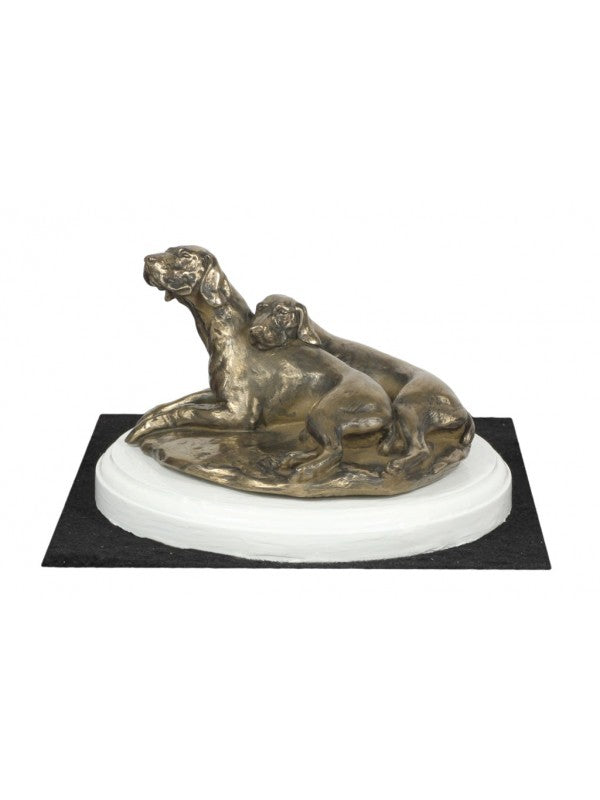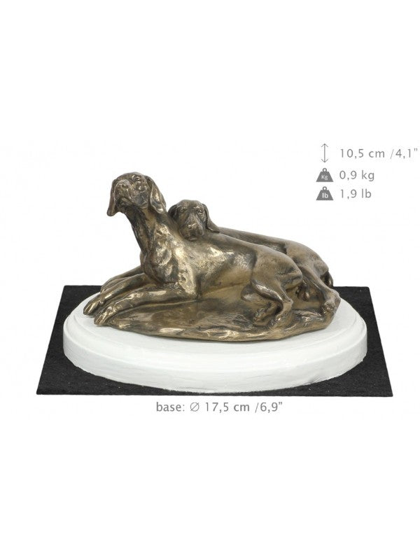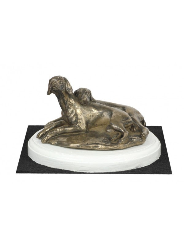 Handgjord Weimaraner-statyetti kallstöpt brons med interiör i stark kvarts ståendes på bas i vitt trä i begränsad upplaga.