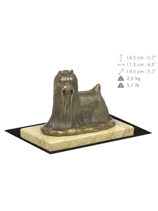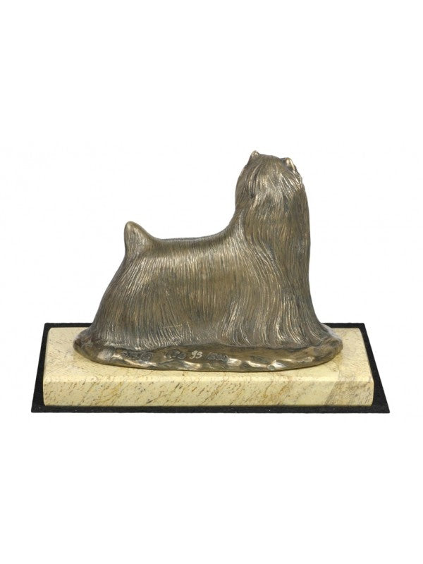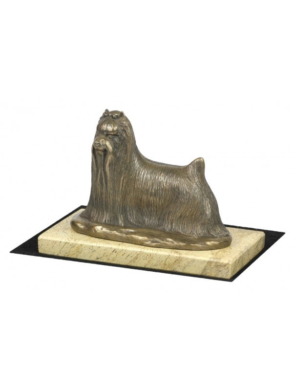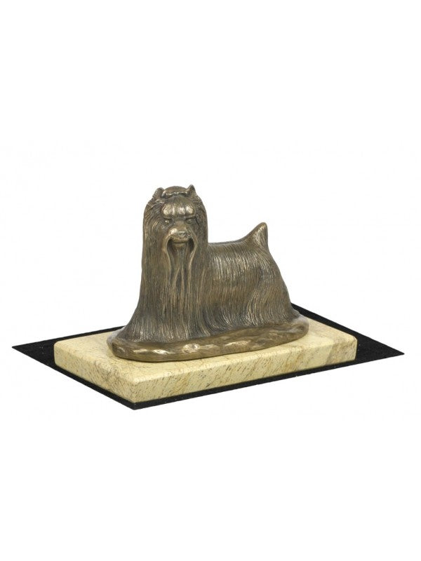 Handgjord Yorkshireterrier-statyett i kallstöpt brons med interiör i stark kvarts ståendes på sandmarmor i begränsad upplaga.